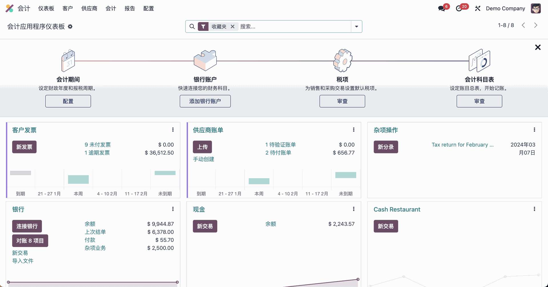 Odoo 已预先配置,可满足您所在国家/地区的要求:会计科目表、税务、特定国家/地区报告、电子发票、审计文件和财务状况,以自动应用正确的税率和账户。