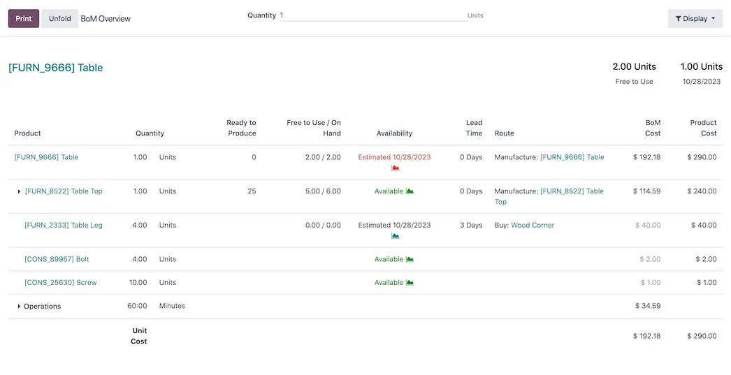 模拟制造订单,通过即时产能计划、组件可用情况和成本控制,预计生产情况。获取及时补货建议,并选择如何完成部件:生产或购买、分包、从其他仓库发货等。
