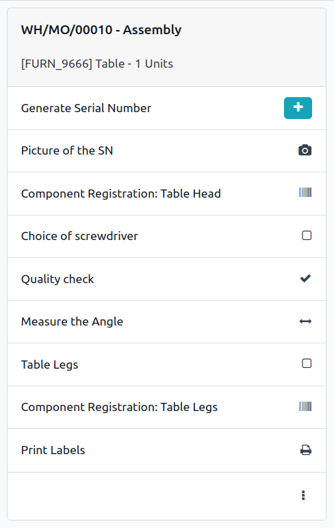 追踪组件或生产批次(批量)或序列号。只需点击一下,即可获得所有操作的清晰追溯。