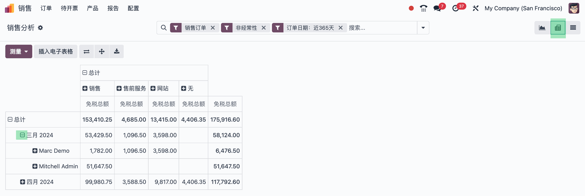 类似于 Excel表格的数据透视图表,可通过分组方式展开数据,并在测量按扭中选择要分析的数量维度。在 Odoo中使用透视图表,可实时、灵活地按不同的维度统计数量、金额。支持一键导出Excel表格