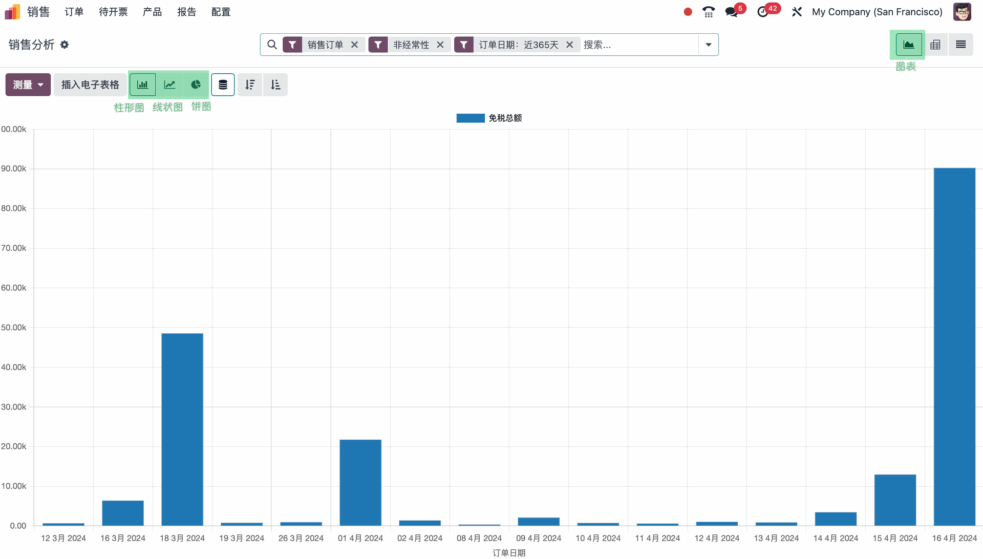 您可以在大多数Odoo应用的报告 主菜单中找到多个子报告菜单,便于您进行分析并可视化您的记录数据。