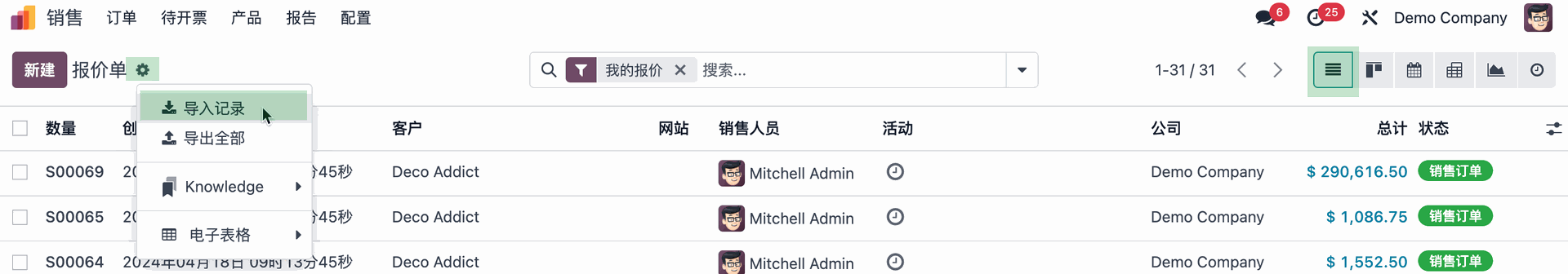 Odoo中的任何功能都自带导入(创建、更新)、导出数据(Excel、csv)功能。常用于系统初始化、数据分析、批量数据处理。此功能也作为 Odoo实施人员,必备技能之一。