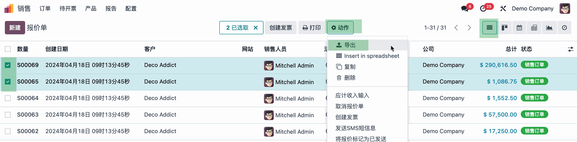 在功能列表中,勾选需要导出的数据记录,然后点击 动作  导出
