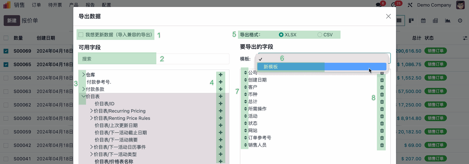 6. 模板:在下拉列表中选择新模板,可保存当前选择的字段作为新的导出模板