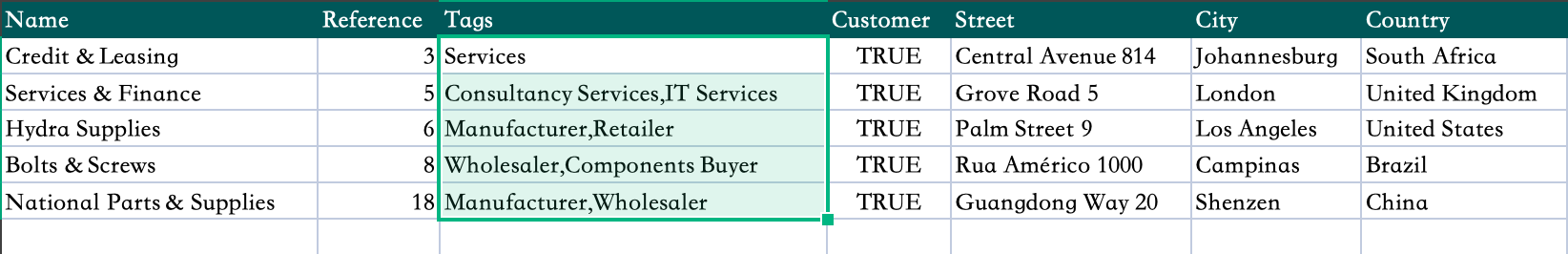 导入many2many字段时,应以逗号作为分隔,例如, 我们针对某个客户导入Manufacturer、Retailer时,可把导入字段的值设置为 Manufacturer,Retailer 且逗号间不允许存在空格
